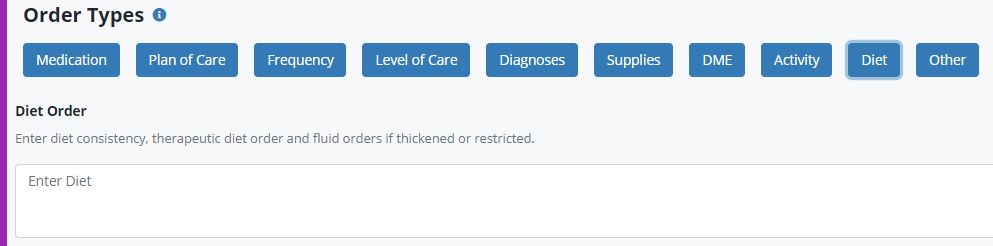 Diet orders can only be updated directly through a Physician Order document. Access the Physician Order by clicking the Add Orders button in the Plan of Care Review section of a clinical document, or by scheduling a Physician Order in the Schedule Center. In the Physician Order, select the Diet button under Order Types.