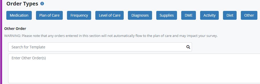 **Orders entered under the Other category will not flow the Comprehensive Plan of Care, and may increase your agency’s risk of survey deficiency. Most orders can be entered using one of the order types provided in the Physician Order document.
