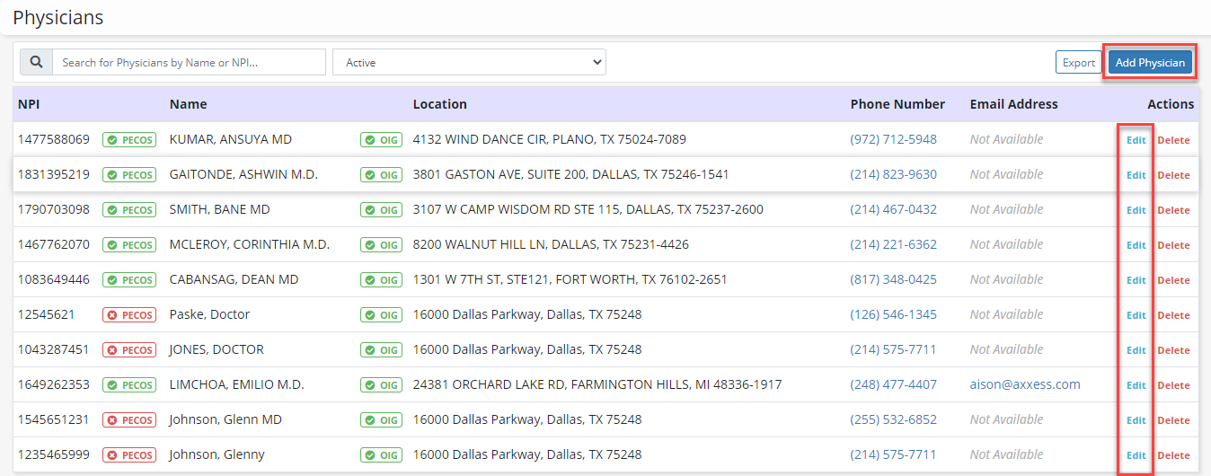 Select Edit under Actions to enter an existing physician’s preferred order delivery method, or click Add Physician to add a new physician.
