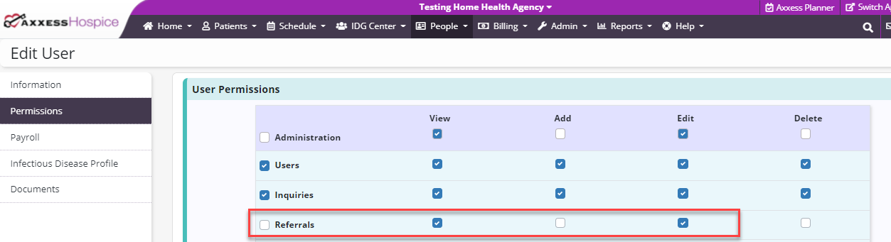 To give a user permission to edit referrals, edit the user’s profile and navigate to the Permissions tab. In the Administration section, select View and Edit next to the Referrals permission. Click Save to finish granting the permissions to the user.