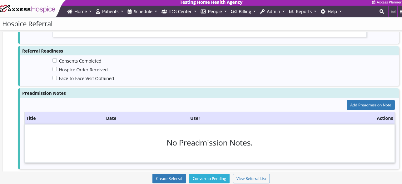 To add a preadmission note to a referral, users must have permission to edit referrals in Axxess Hospice.
