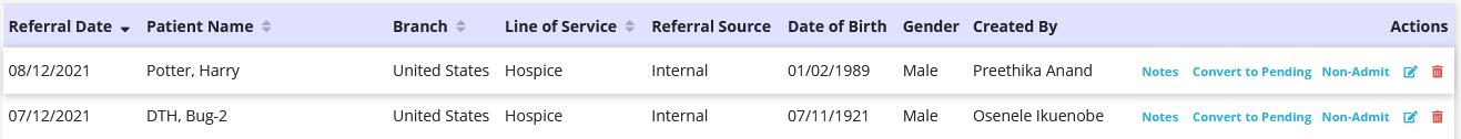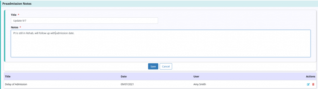 Users can view, edit and delete preadmission notes using the icons under Actions.
