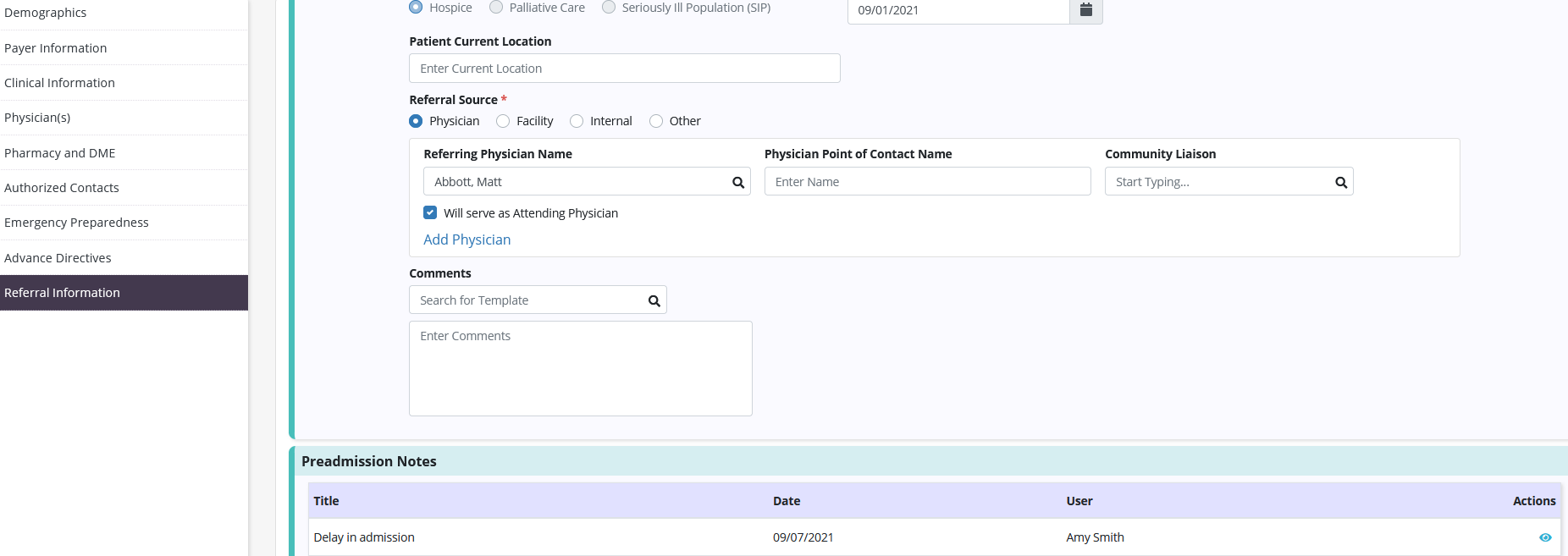 A Preadmission Notes section now appears on the Referral Information tab in each patient’s profile. This section includes the table of previously added preadmission notes with the ability to view each note.