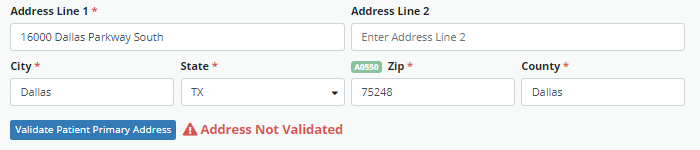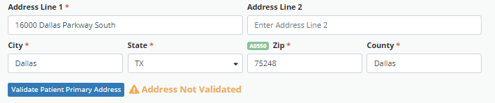 The patient’s primary address must be validated before completing a referral and when making changes to a patient’s chart. To validate an address, click the Validate Patient Primary Address button. A box will appear and display any changes that may be needed to validate the address. To accept the changes, click Use Validated Address.