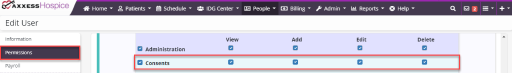 To give a user permission to manage consents in Axxess Hospice, edit the user’s profile and navigate to the Permissions tab. In the Administration section, select View, Add, Edit and Delete next to Consents. Click Save to finish granting the permissions to the user.
