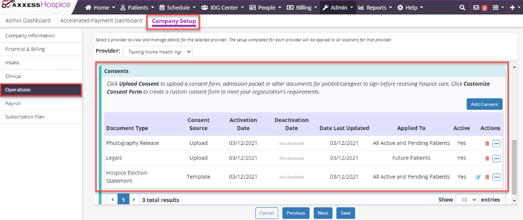 To add consents, navigate to Company Setup under the Admin tab. On the Operations tab, navigate to the Consents section. To customize a built-in consent template, select Add Consent and click Select Consent Template.