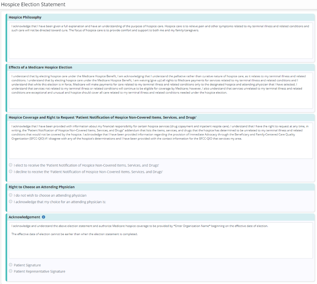 In the hospice election statement, users are only required to edit the Acknowledgement section.