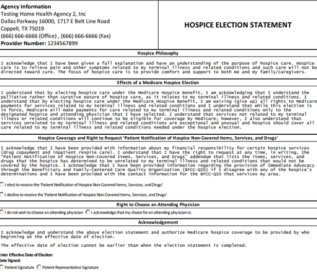Axxess Hospice now enables users to print unsigned PDF copies of hospice election statements. The effective date of election will display on each printed election statement.