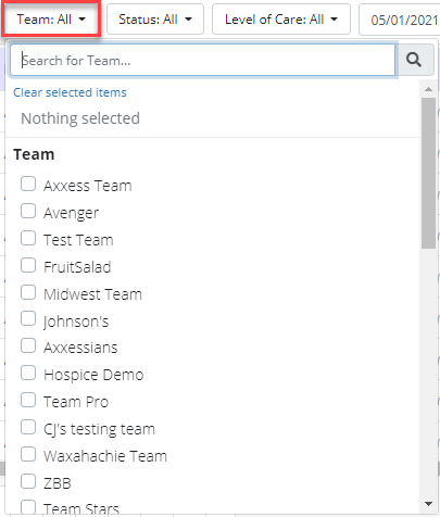 Axxess Hospice now features new provider and branch filters throughout the solution to optimize the user experience on each page. Many pages also feature a team filter, so users can easily manage and monitor activities by team.