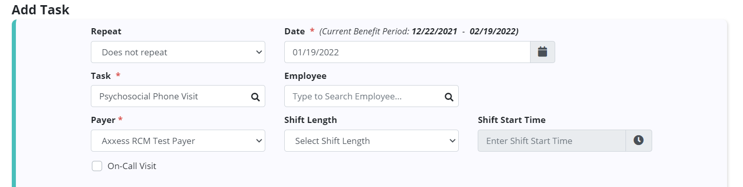 In the Add Task window, enter the date and select Psychosocial Phone Visit from the Task menu. Complete the remaining fields and click Save Task. These visits will count against the social work frequency.