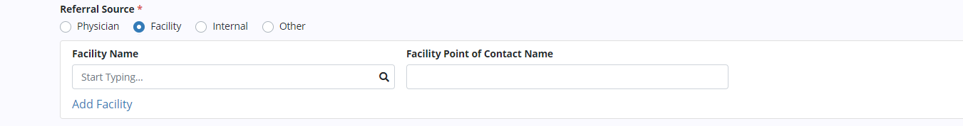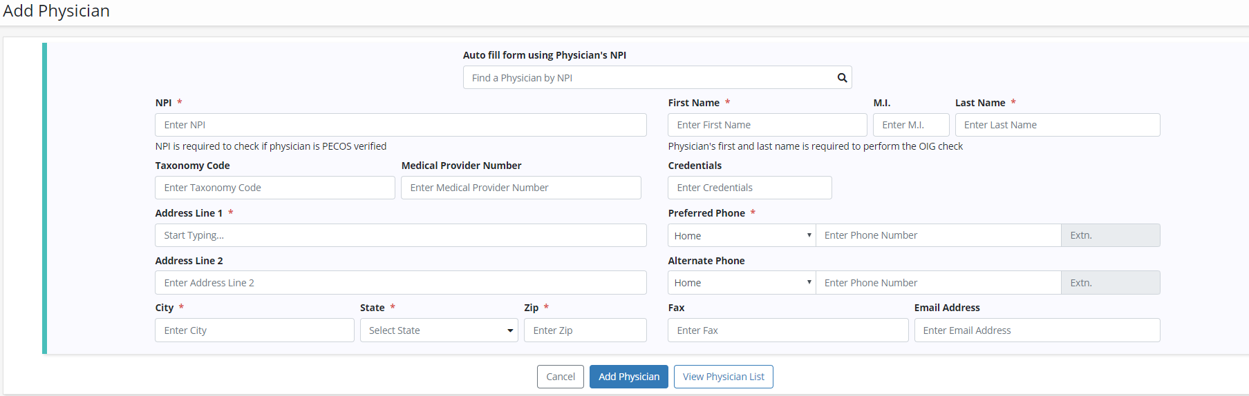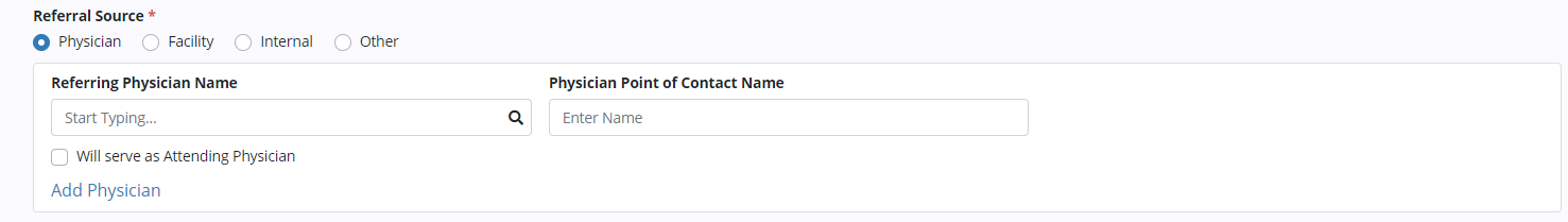 Start typing in the Referring Physician Name field to select a physician from your agency’s Physicians list. If the referring physician is not on your agency’s Physicians list, click Add Physician.