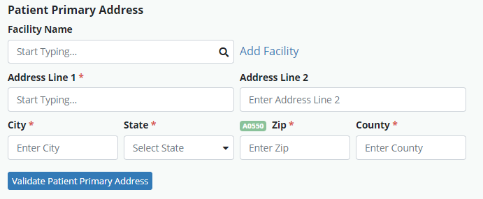 The Facility Name field has been added under Patient Primary Address, Patient Visit Address, and Patient Mailing Address. When adding a facility, start typing in the Facility Name field to filter facilities on your agency’s Vendors list. Select a facility to auto-populate its address based on information in the Vendors list. If the facility is not on the list, click Add Facility to add the facility to your agency’s vendors.