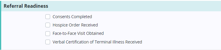 The new Referral Readiness section has been added to help agencies track and determine when referrals are ready to be admitted. Information in this section is not required to convert the patient to pending. Check the boxes for the following items when they are completed or received: