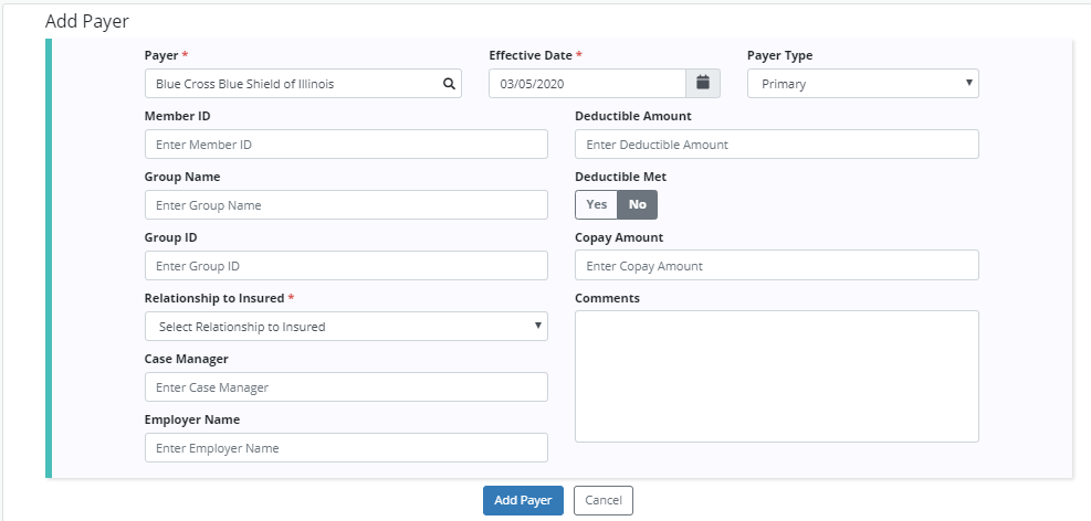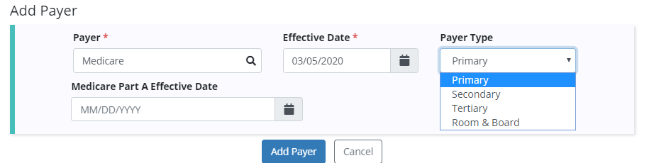 To add a payer, click the Add Payer button. Enter the payer name, effective date for the patient, and select a payer type.