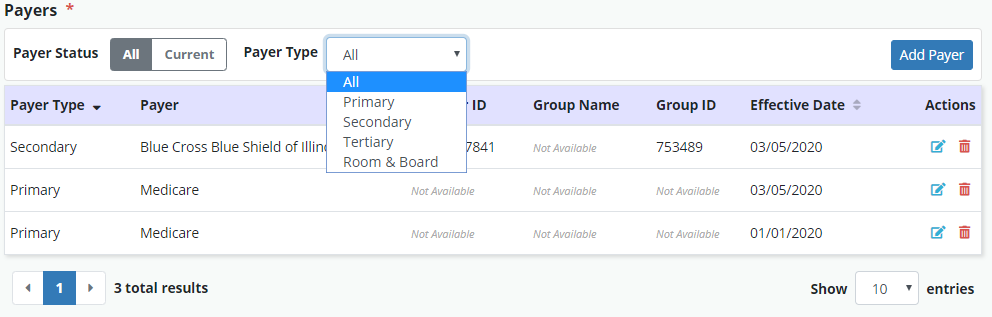 To add another payer, repeat this process. The payer status will enable you to view current payers for the patient by default. To view previous payers for the patient, select All next to Payer Status. To filter by payer type, select an option from the Payer Type drop-down menu.