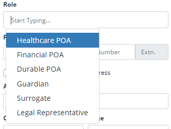 The Role field enables users to identify the role of the authorized contact. Users can select one or more roles from the drop-down menu.