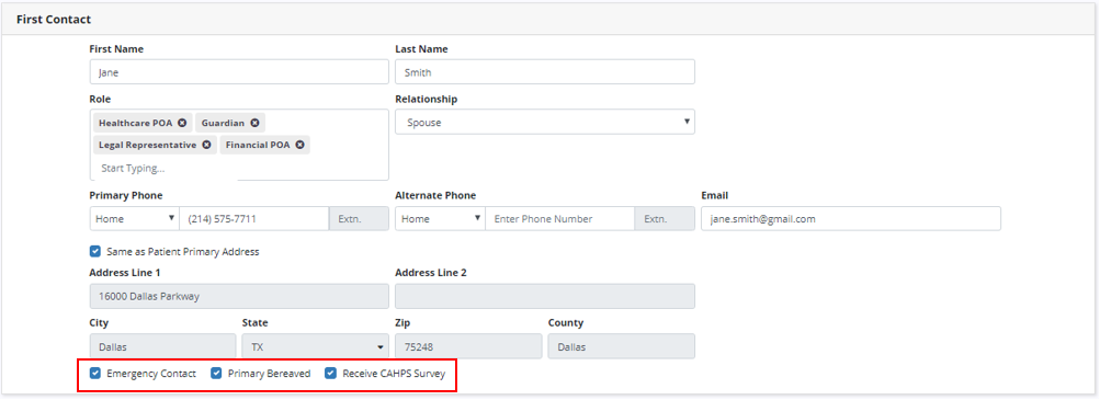 At the bottom of each contact card, check if the contact is the patient’s Emergency Contact or Primary Bereaved and if this person is the appropriate recipient for the CAHPS survey.