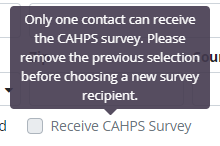 Only one contact can be selected to receive the CAHPS survey. To change the CAHPS survey recipient, deselect the box for the existing recipient before selecting the Receive CAHPS Survey box for the new CAHPS survey recipient.