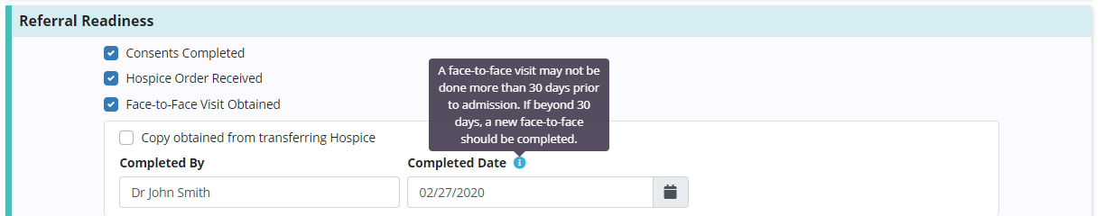 When Face-to-Face Visit Obtained is selected, users can document the name of the person who completed the face-to-face visit and the date it was completed. To facilitate compliance, the system restricts this date to be no more than 30 days before the patient’s admission.