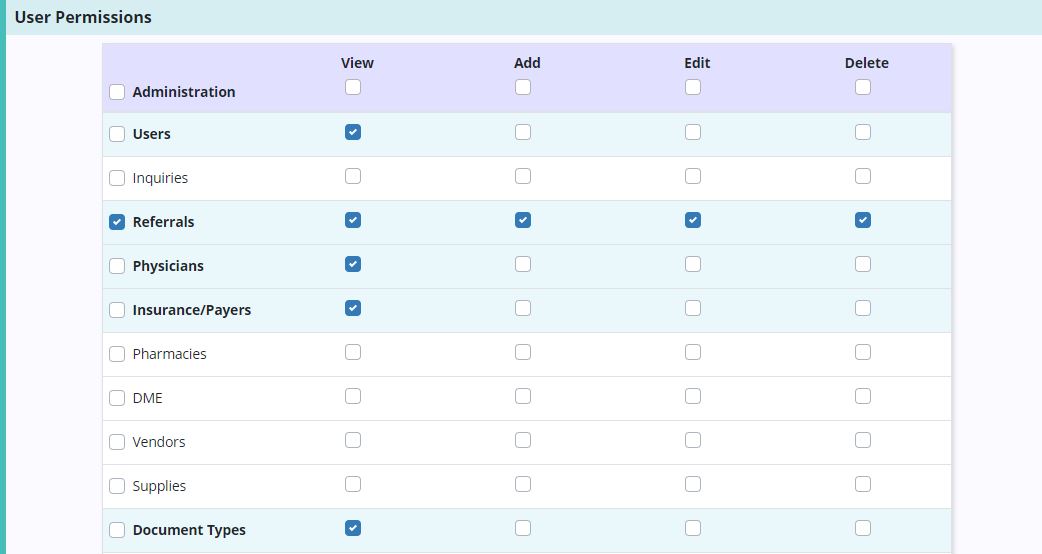 Users must also have access to view the following items, as information in these lists is used when adding a patient’s referral information. Select View next to Users, Physicians, Insurance/Payers, and Document Types.