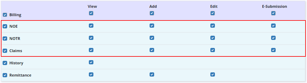 People tab ➜ People Center ➜ Edit ➜ Permissions tab ➜ Billing section ➜ NOE/NOTR/Claims ➜ View and Edit ➜ Save