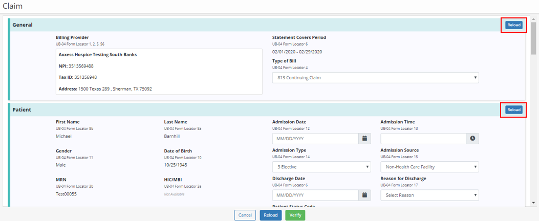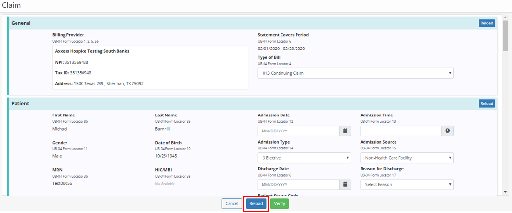 Note: Selecting the Reload button at the bottom of the page will reload all information in the claim. Any changes that have been made during verification will be lost.
