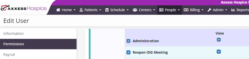 Users must have permission to view reopened IDG meetings in Axxess Hospice. Edit the user’s profile and navigate to the Permissions tab. In the Administration section, select View next to the Reopen IDG Meeting permission. Click Save to finish granting the permissions to the user.