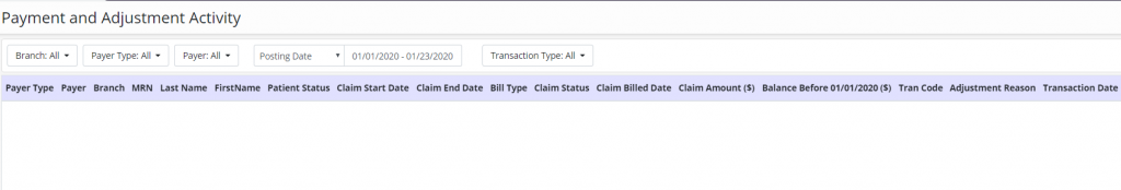 Report Includes: Payer Type, Payer, Branch, MRN, Patient Name, Patient Status, Claim Start Date, Claim End Date, Bill Type, Claim Status, Claim Billed Date, Claim Amount ($), Balance Before Selected Start Date ($), Tran Code, Adjustment Reason, Transaction Date, Post Date, Check Number, Payment ($), Adjustment ($), Current Balance ($)