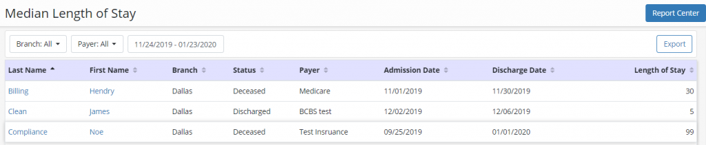 Report Includes: Patient Name, Branch, Patient Status, Payer, Admission Date, Discharge Date, Length of Stay