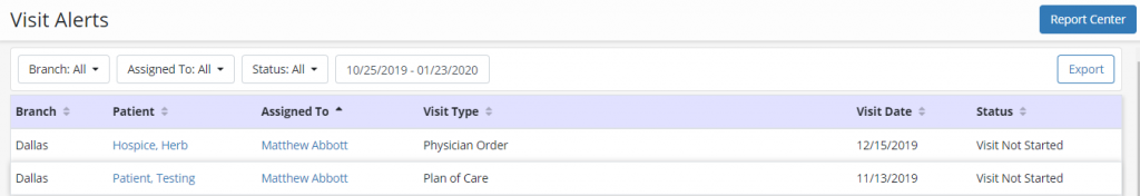 Report Includes: Branch, Patient Name, Assigned To, Visit Type, Visit Date, Visit Status