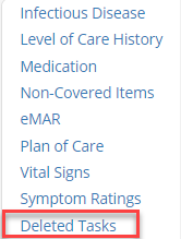 To access deleted tasks, navigate to the patient’s chart and select Deleted Tasks under Quick Links.