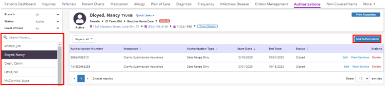 Choose the patient from the patient list or use the search section to locate the patient and click Add Authorization on the left side of the screen. If a patient does not have a room and board payer, no authorizations can be added for the patient.