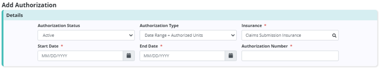 Add the authorization details, including authorization status, authorization type, insurance and authorization number. Based on the authorizations selected, a start date and end date may be required.