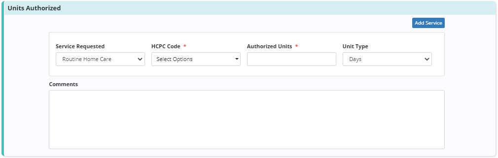 Once all fields in the Details section are complete, enter the services authorized or requested by the payer. In the Units Authorized section, select the HCPC code based on the service location (Q code). If Authorized Units is selected as the authorization type, the number of authorized units and unit type will be added to the service requested. If more than one service is authorized or requested, click the Add Service button.