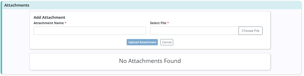 Finally, authorization documents can be added to each authorization. To attach authorization documents to an authorization, click Add Attachment in the Attachments section. Enter the name of the file and select a file to attach. Click Upload Attachment to finish adding the attachment to the authorization.
