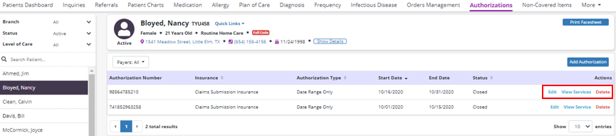 Patients tab ➜ Authorizations