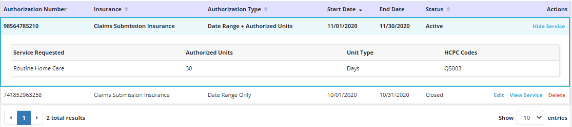 Click View Service to view the services included in the authorization. To remove an authorization, click Delete.
