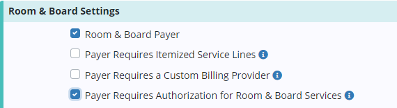 Select Edit next to the appropriate payer and navigate to the Billing Information tab. Under Room & Board Settings, check the box next to Payer Requires Authorization for Room & Board Services. Click Save to confirm the changes.