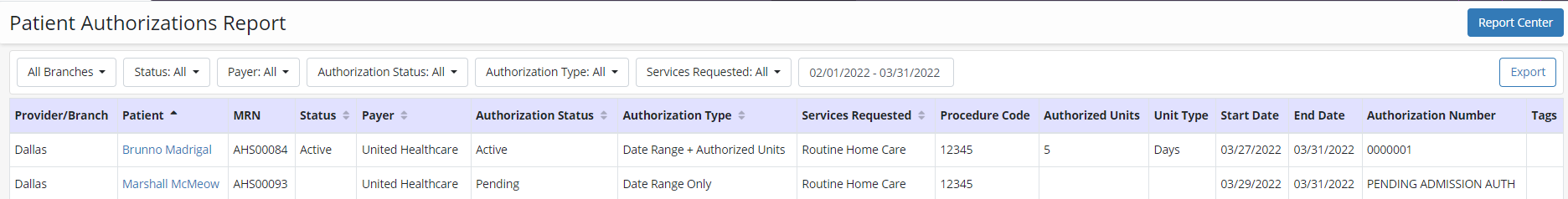 Reports tab ➜ Report Center ➜ Patient Reports ➜ Patient Authorizations Report