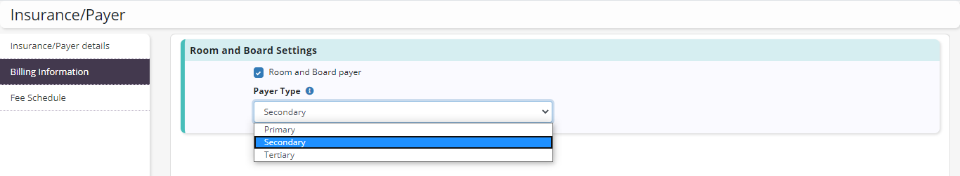 On the Billing Information tab, check the box for Room & Board Payer. Select Primary, Secondary or Tertiary from the Payer Type menu to specify the sequence that the room & board claim will be billed. Click Save to finalize changes to the payer.