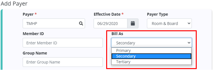 When adding a room & board payer for a patient, a new Bill As menu has been added to correspond with the Payer Type selected for the payer. If the payer type was selected during the payer setup, this information will pre-populate when the payer is selected for the patient, and can be edited if the patient needs to have room & board claims billed in a different sequence.