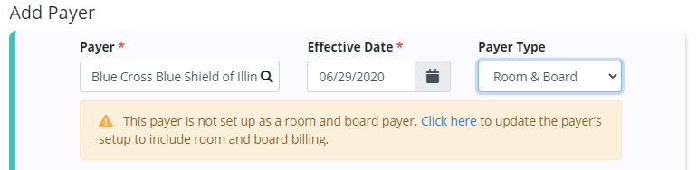 If a payer has not been previously set up as a room & board payer, users are notified and can click the hyperlink to complete the payer changes in a new browser tab. The payer must be updated before it can be saved as the patient’s payer.