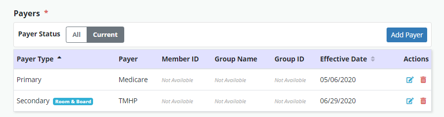 In the patient’s chart, the Payer Type column under the Payers section will indicate the selected payer type corresponding with the billing sequence of each payer for the patient. A Room & Board badge will appear next to room & board payers in the Payers list.