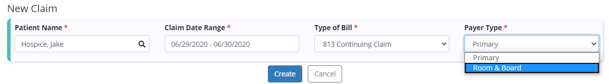 Billing tab ➜ Claims ➜ New Claim ➜ Complete fields ➜ Room & Board in Payer Type field ➜ Create