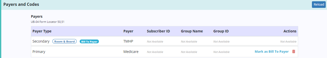 Each of the patient’s active payers will appear in the Payers and Codes section of the claim. Based on the payer type selected during claim creation, one payer will be marked Bill to Payer. This is the payer to which the claim will be sent. To update this payer, select Mark as Bill to Payer next to another payer. Only one payer can be marked as the bill to payer.