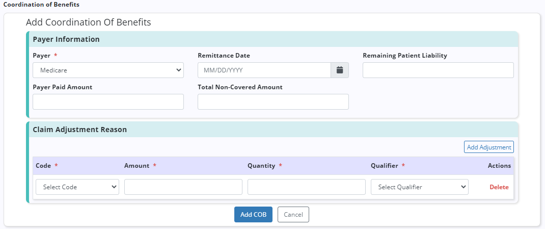 When a non-primary payer has been marked as the bill to payer, Coordination of Benefits (COB) details can be added for each additional payer. To add COB details, click Add COB and complete the following sections: