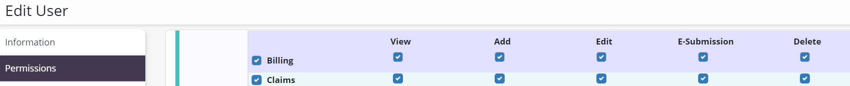 To create and submit room and board claims, users must have permission to view, add and edit claims. To give a user permission to view, add and edit claims, navigate to the Billing section. Select View, Add and Edit next to the Claims permission.