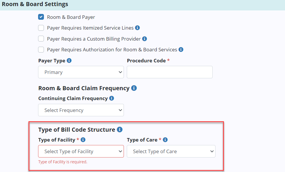 On the Billing Information tab, select Room & Board Payer under Room & Board Settings. Under Type of Bill Code Structure, select the type of facility and type of care. Once the appropriate selections have been made, click Save at the bottom of the screen.