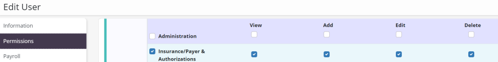 People tab ➜ People Center ➜ Edit ➜ Permissions tab ➜ Administration section ➜ Insurance/Payer & Authorizations ➜ View/Add/Edit