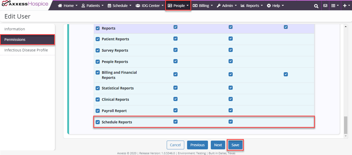 People tab ➜ People Center ➜ Edit ➜ Permissions tab ➜ Reports section ➜ Schedule Reports ➜ View/Export ➜ Save